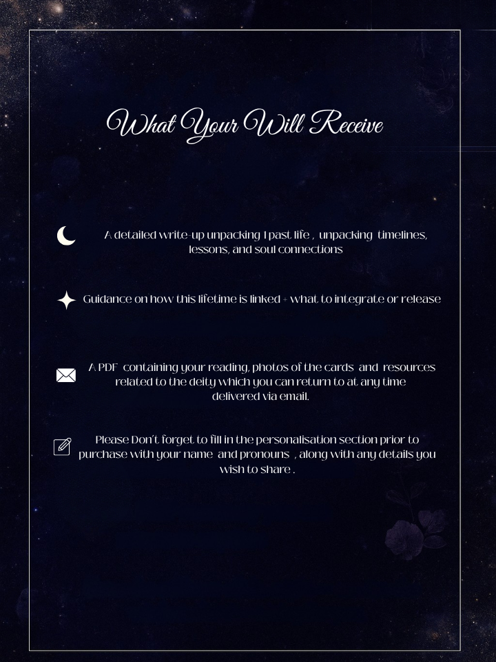 ✍️ Please leave your name and pronouns in the order notes. You can share any repeating dreams, déjà vu, or specific areas of life you feel are karmic, these can help tune the reading more deeply