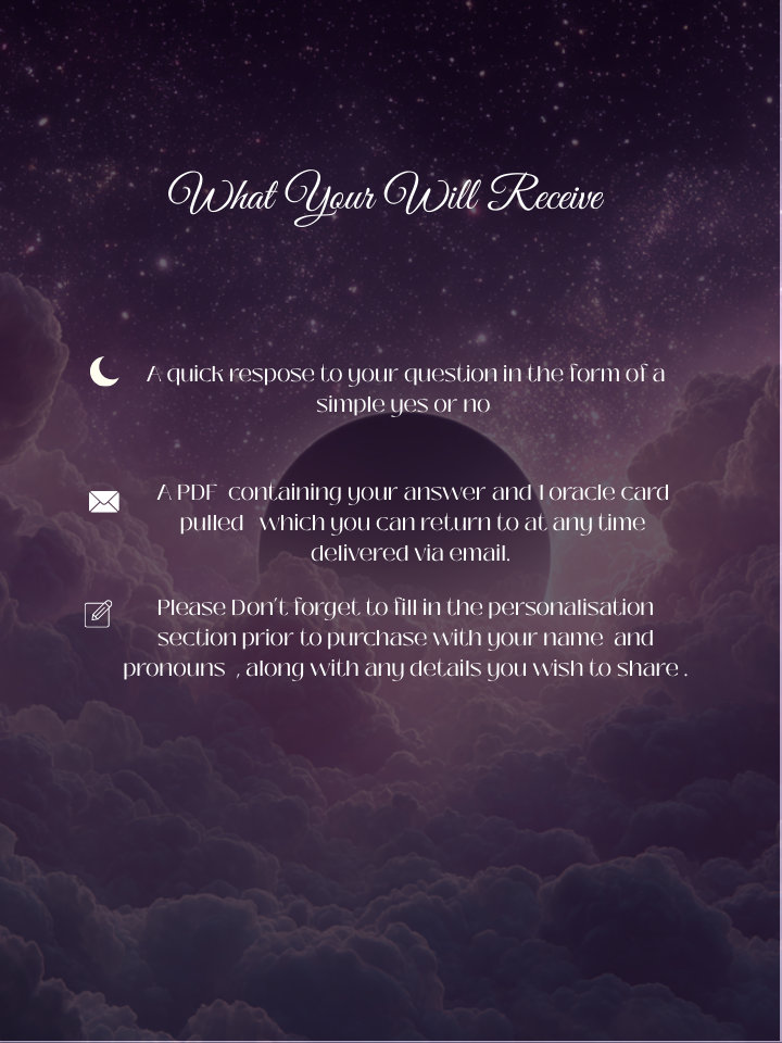 Sometimes you just need a solid YES or a gentle NO (with none of the fluff). This reading is quick, clear, and ideal for when you’re standing at a crossroads and need a vibe check from spirit.